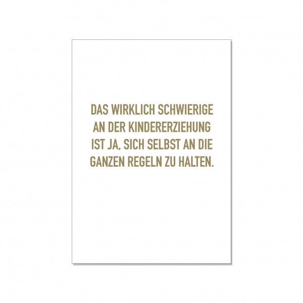 Postkarte hoch, DAS WIRKLICH SCHWIERIGE AN DER KINDERERZIEHUNG IST JA, SICH SELBST AN DIE GANZEN REGELN ZU HALTEN, gold